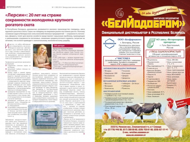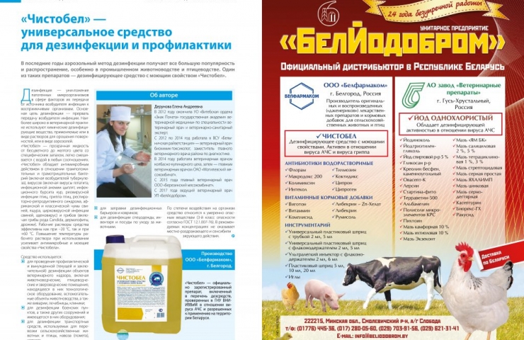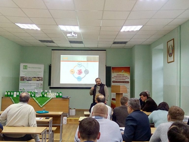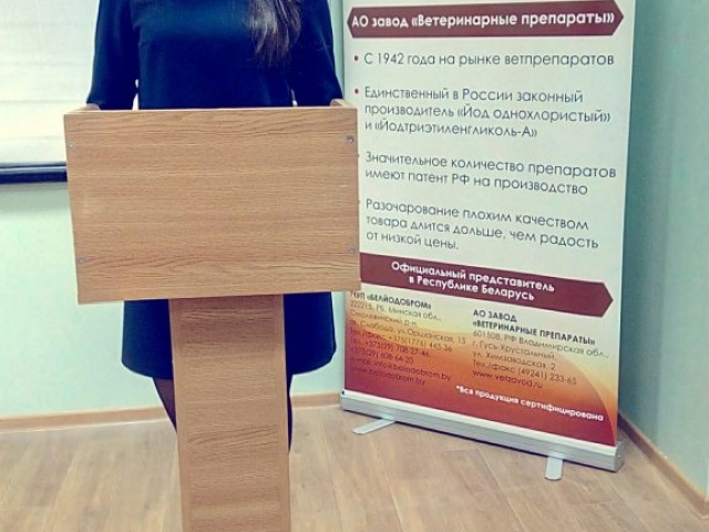От УП «Белйодобром» выступила, с докладом перед участниками форума, ведущий ветврач Дерунова Е.А. С большим интересом аудитория приняла тему о дезинфекции животноводческих комплексов препаратами производства АО завод «Ветеринарные препараты» и ООО «Белфармаком»: Йод однохлористый, Гликосан, Креолин, Чистобел, ИТЭГ.